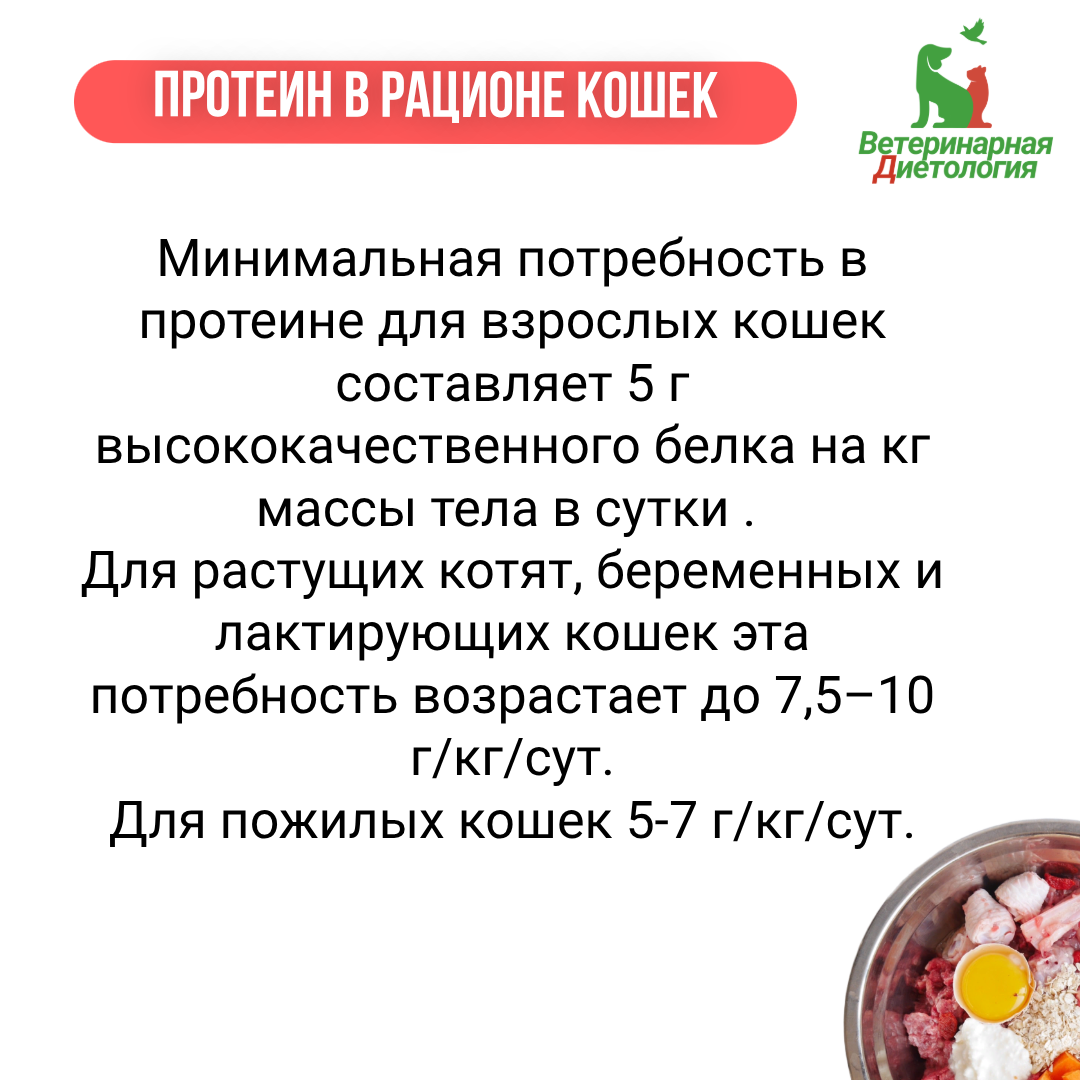 Согласно рекомендациям NRC и AAFCO, минимальная потребность в протеине для взрослых кошек составляет 5 г высококачественного белка на кг массы тела в сутки. Для растущих котят, беременных и лактирующих кошек эта потребность возрастает до 7.5–10 г/кг/сут.