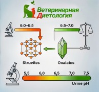 Критика универсальности. Универсальные диеты целевым показателем выбирают диапазон рН 6,2–6,8. Для струвитов это значение может быть недостаточно кислым для быстрого растворения крупных конкрементов по сравнению со специализированными подкисляющими диетами (рН 6,0–6,5). Для оксалатов это значение находится в «зеленой зоне», однако при индивидуальной склонности животного к закислению мочи (например, при диете с высоким содержанием белка без буферных добавок) риск кристаллизации оксалатов сохраняется.